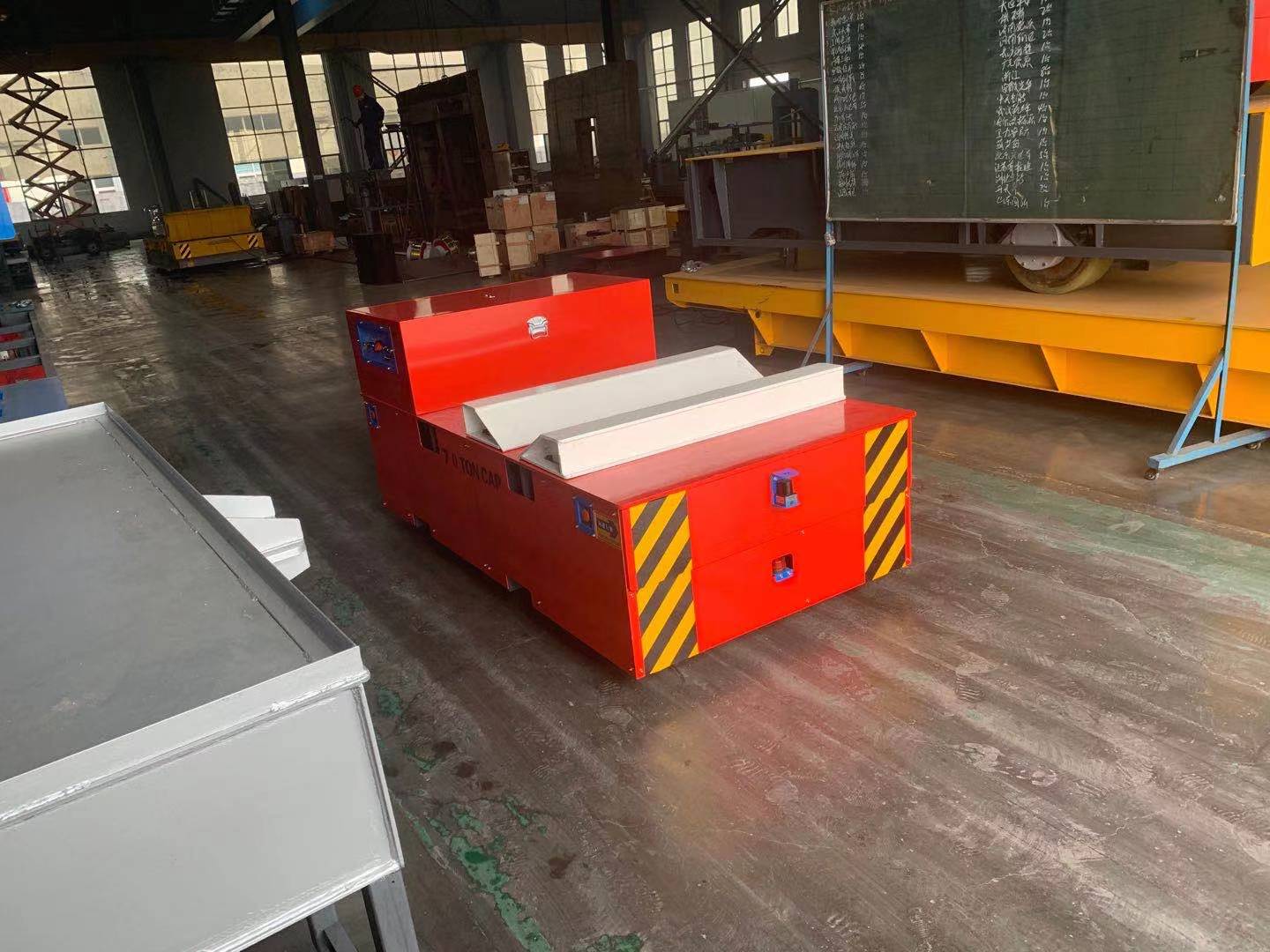 该平车可以在轨道横纵移动满足双向运行,而且可以升降,满足装卸工件