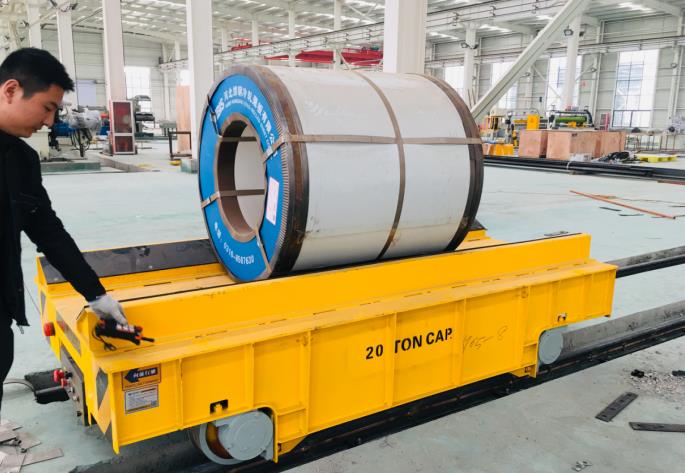 载重:25吨 台面尺寸:3000x2200 操作方式:手柄+无线遥控 供电方式:电池 运输工件:钢卷 轨距:1435
