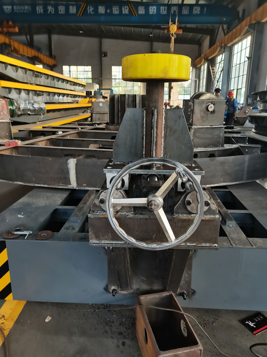 这是客户为终端提供的工程中的一套设备,要处理的事不同直径长度的筒体,车体台面设有电动滚轮架,防窜动端部定位轮,镂空台面方便砂粒堆积,是一套专用定制设备。
