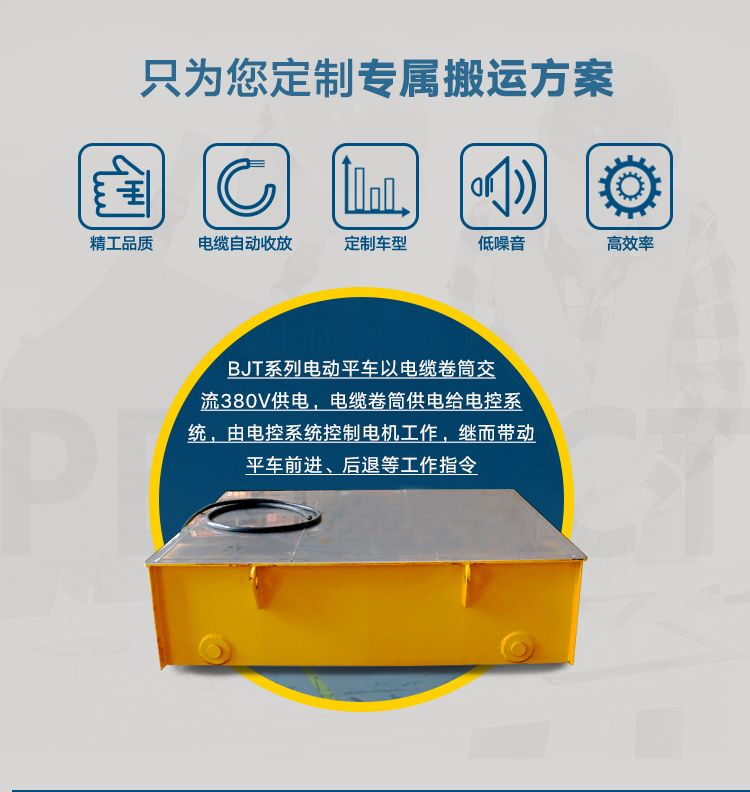 平车上可以加装液压升降系统该系列车适用于恶劣环境,高温环境,防爆环境等场合,运行时电缆卷筒自动将电缆卷起或放出,受卷线筒供电长度的影响,一般运行距离小于200m。